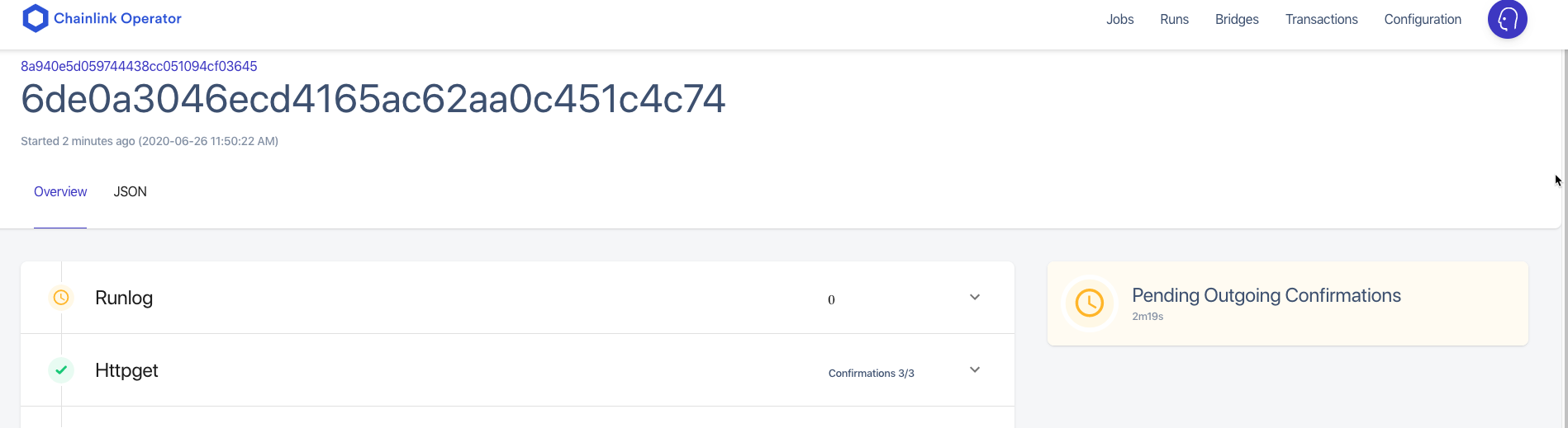 MIN_OUTGOING_CONFIRMATIONS变量在您的.env中太高了(它被设置为默认值)如果你在你的甲骨文合约地址看到挂起的交易,那么它很可能是#2,如果你没有看到,它很可能是#1。