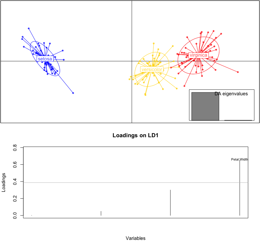 dd.dapc <- dapc(x = iris.s, grp = iris[,5], n.pca = n.pca, n.da = 2,