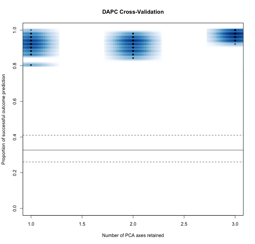 对于PCA-LDA (又称主成分判别分析,DAPC),在数据不拟合和过拟合之间找到最佳的折衷方案是非常重要的。这是非常棘手的,特别是对于高维数据(许多变量=列)。在这种情况下,交叉验证将成为机器学习中的一个问题.唯一要调优的超参数是保留的PC数。