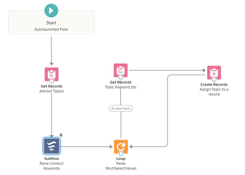 从循环中删除数据库访问一个循环包含一个/一个Create记录元素。要避免达到每个事务流的限制,请将“将主题分配给记录”元素移到循环之外,并让它对集合进行操作。