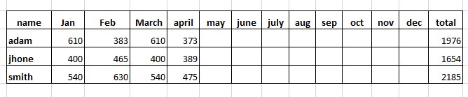 |NAME |'Jan'|'Feb'|'Mar'|'total'|