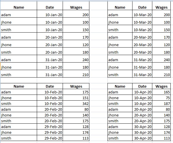 我有一个包含以下字段的employee表:员工姓名、工资日期、我想要汇总的月工资。这是表数据。我使用oracle数据库11g。
