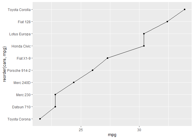 ggplot(aes(mpg, reorder(cars, mpg), group=1),size=5)+geom_line()+geom_point()