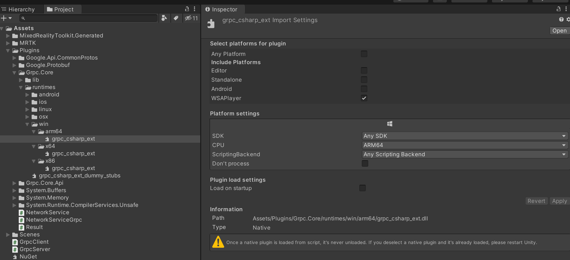 我想要构建我的统一-AR应用程序运行在HoloLens 2上。我们使用gRPC进行HoloLens设备和桌面PC之间的进程间通信以传递信息。HoloLens 2具有ARM处理器体系结构,而gRPC不为其提供grpc_csharp_ext.dll。