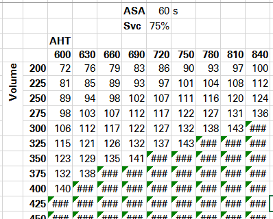 例如:我们的服务水平为75%的呼叫必须在60秒内应答。下面的图表探讨了与我们的业务相关的各种数量和处理时间的人员配置。