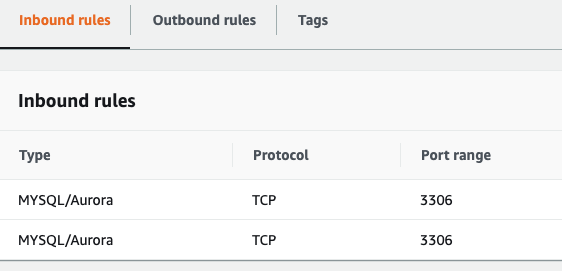 RDS-SG)上的安全组允许从Amazon实例(Redshift-SG)上的安全组进入端口3306,该安全组允许来自DMS-SG的5439端口的入站流量。也就是说,DMS实例应该有自己的安全组,可以从其他安全组引用。安全组分别应用于每个实例。具有“相同”安全组的实例不会获得任何与彼此通信的特殊能力,除非将其作为规则专门添加到安全组中。