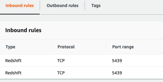 安全组设置也是相同的。RDS和Redshift都有两个安全组(空组和引用空组的入口组)。入口安全组的入站规则如下,出站规则默认为允许所有传出通信。