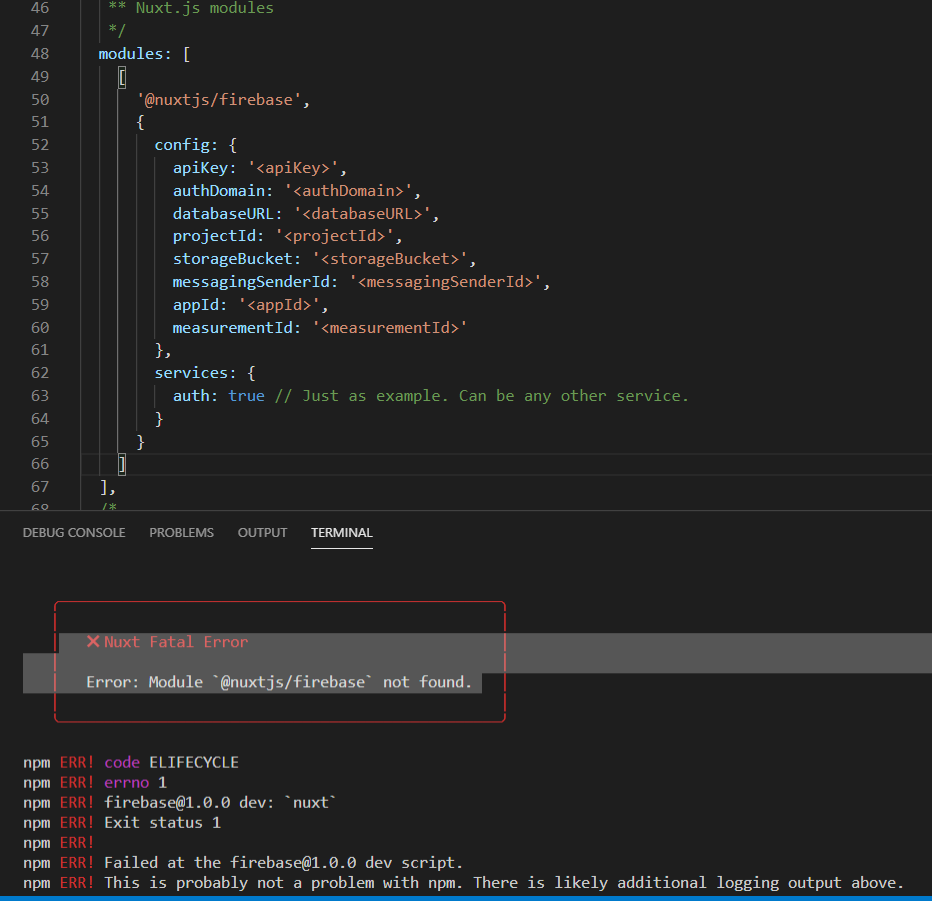 我试着安装@nuxtjs/firebase,我遵循这里的所有指令:https://firebase.nuxtjs.org/guide/getting-started/