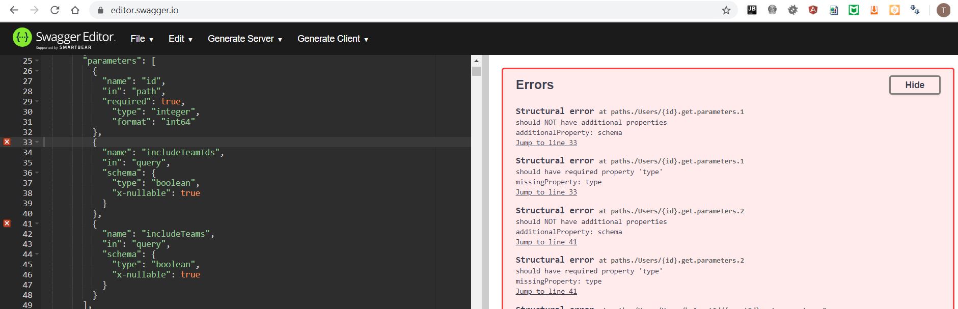 }但是,当我将生成的OpenAPI文件粘贴到Swagger中时,它会显示错误: