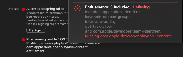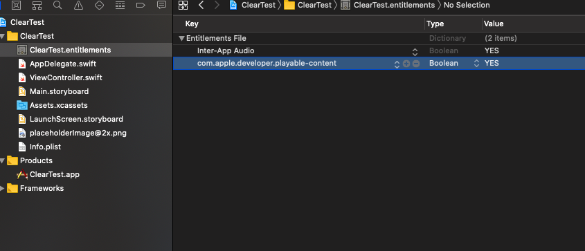 我需要你的帮助。苹果已经接受了我关于苹果CarPlay开发的请求。1.我在我的file.entitlements中插入了com.apple.developer.playable-内容行: