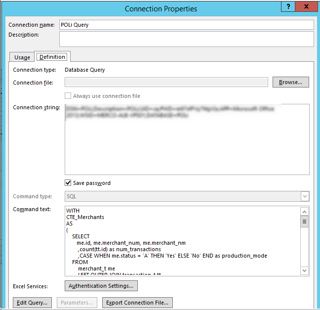 我怀疑这与查询本身有关,可能是因为参数被隐藏在子查询中。我对这件事不太了解。任何关于如何让这件事起作用的建议,不管怎样,都是可行的。我听说您可以创建视图并查询视图,但目前我对SQL和Excel的了解有限。