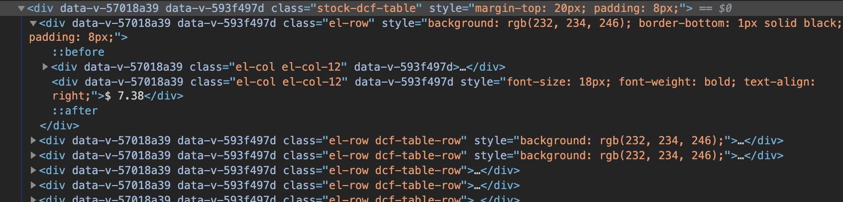 我使用Cheerio尝试在嵌套的子元素中获得一个值。值为$7.38,如下面的HTML所示。如图所示,它位于最后一个div元素、第一个子div元素、div类"stock-dcf-table“中。