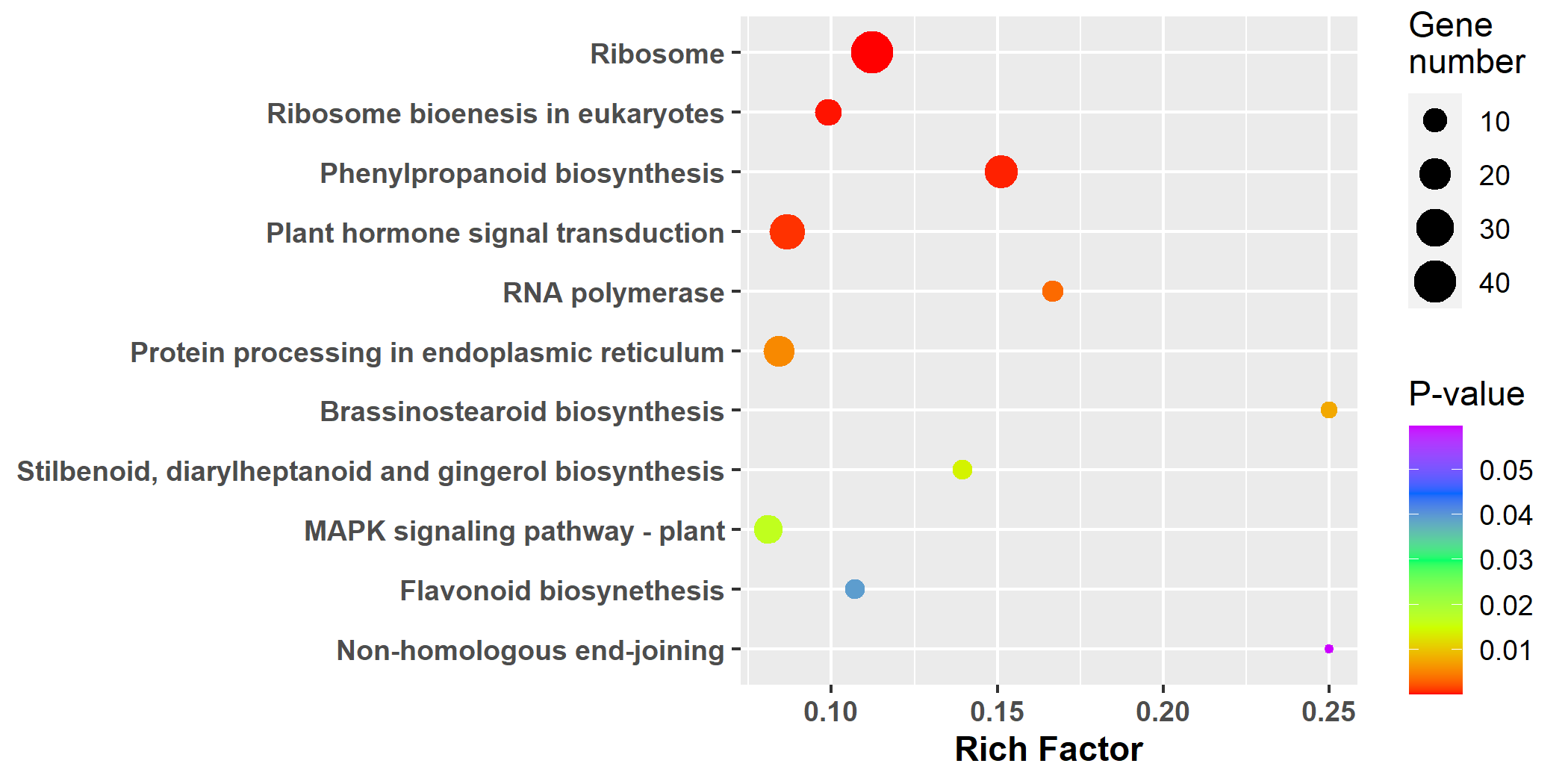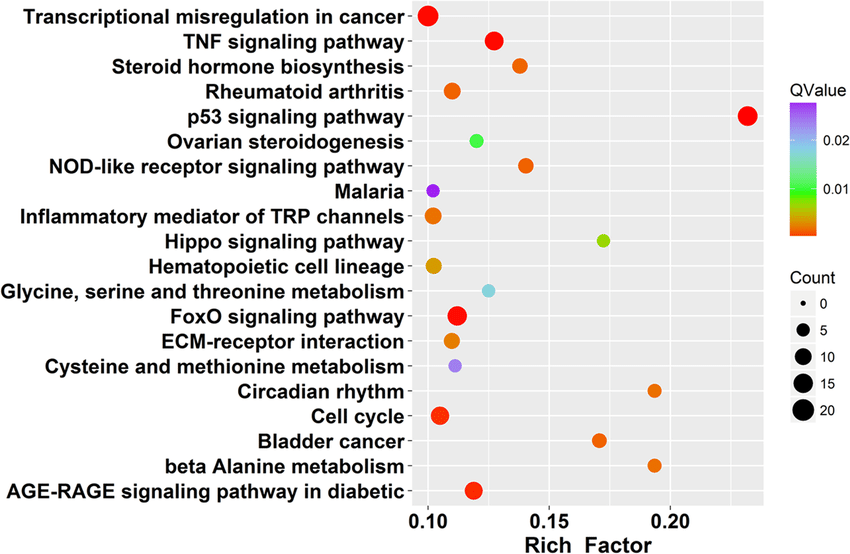 我试图制作一个气泡图,展示来自RNA seq实验的KEGG通路信息。我希望y轴表示路径项,x表示丰富的因子,气泡根据p-vale表示,气泡的大小基于基因数。我附上了我想要做的东西的图片(表1-我的输入数据)和我想要它的例子(图1-气泡图示例)。