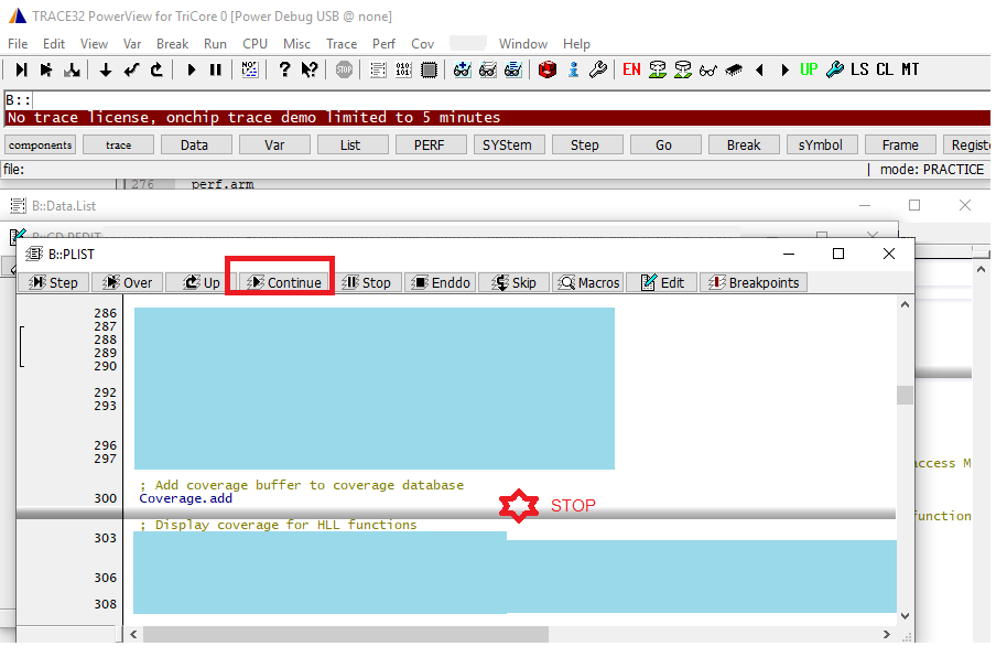 ; process the trace buffer在将覆盖缓冲区添加到覆盖数据库的"Coverage.ADD“命令之后,Trace32将停止其执行,并需要用户的手动操作。“停止”意味着Trace32将在下一个CMM语句中中断,用户必须单击“继续”按钮才能运行。
