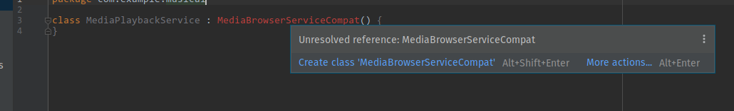 我是android开发的新手。我想要创建一个以客户端服务器方式工作的音乐播放器。我现在正在尝试创建服务器部分。我发现我可以使用MediaBrowserServiceCompat实现这一点,正如它在正式文档这里中所说的那样。但是当我尝试在我的项目中使用它时,它说Unresolved reference: MediaBrowserServiceCompat