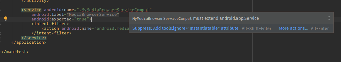 我在网上搜索并找到了这。所以我知道这条信息意味着什么,但我不知道如何在这种情况下解决它。我的宣言仍然是一样的:MyMediaBrowserServiceCompat must extend android.app.service