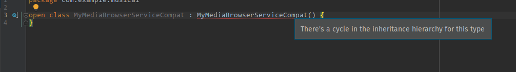 关于There's a cycle in the inheritance hierarchy for this type消息的一个注意事项:这是因为您实际上指的是作为父类和子类的同一个类,这将无法工作,因为它将要求父类返回。之所以“工作”,是因为您现在只引用自类MyMediaBrowserService存在以来可以找到的实际文件。您将需要更新您的服务,以实际继承MediaBrowserServiceCompat以使其正常工作,并且当您有它的依赖项时,它应该可以工作。