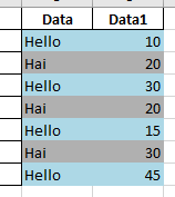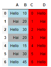 df1 = pd.DataFrame({'Data': ["Hello", "Hai", "Hello", "Hai", "Hello", "Hai", "Hello"],'Data1': [10, 20, 30, 20, 15, 30, 45], })