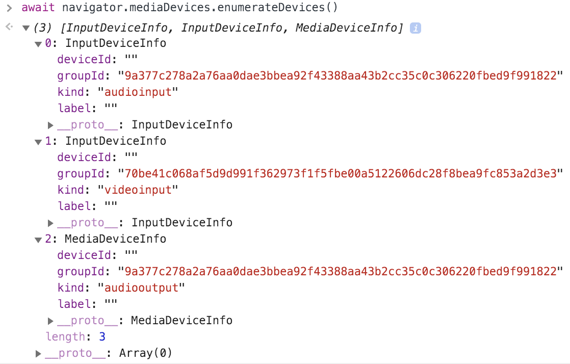 我尝试了MediaDevices API (mediaDevices.enumerateDevices),但这并没有显示屏幕设备的信息: