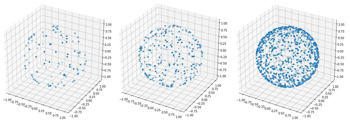 如果你想在球面上产生均匀分布的点,你可以利用这样一个事实:如果你切割一个有两个平行平面的球,那么两面之间的球面条的面积只取决于两平面之间的距离。因此,可以使用两个均匀分布的随机变量在球面上得到均匀分布: