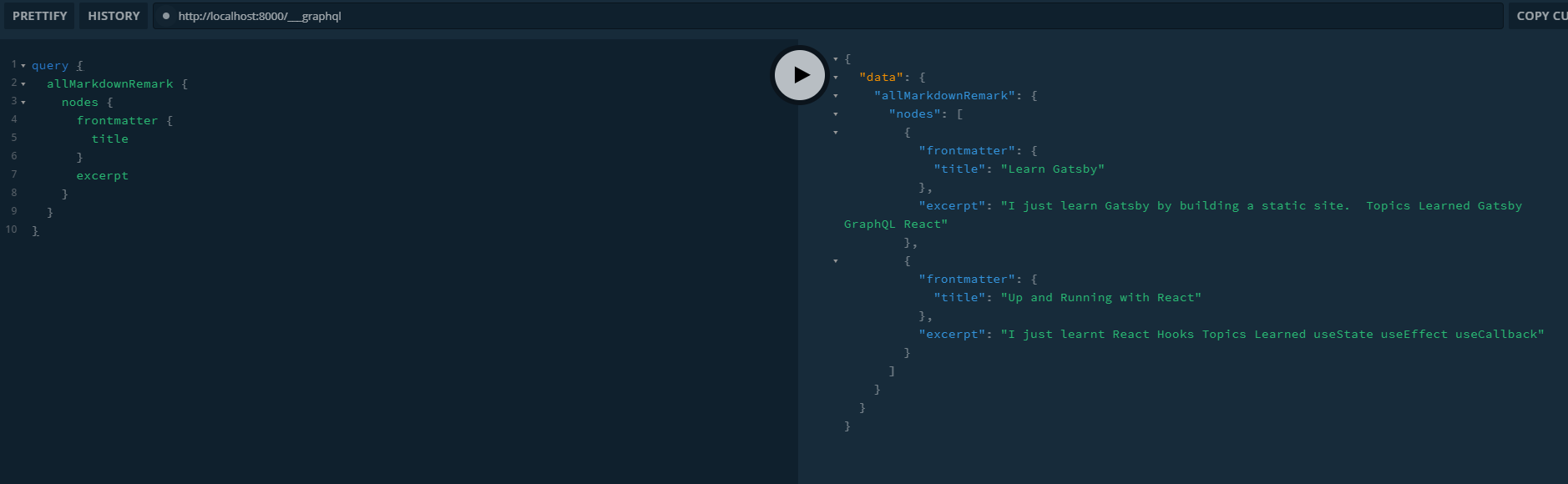 }我已经验证了.env文件中的API键,也在graphQL操场上检查了blogQuery返回结果。以下是localhost的结果:8000/_graphQL