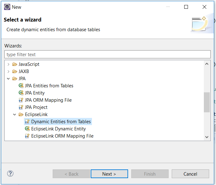 通过olingo映射文件是不可能的。此文件仅用于重命名或提取属性或集合。我们需要生成eclipselink-orm.xml文件。你不需要手工完成这些步骤。您可以很容易地从JPA菜单中选择Dynamic Entities from Tables菜单,如下向导所示: