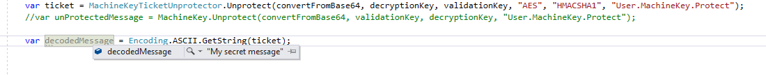 var ticket = MachineKeyTicketUnprotector.Unprotect(convertFromBase64, decryptionKey, validationKey, "AES", "HMACSHA1", "User.MachineKey.Protect");