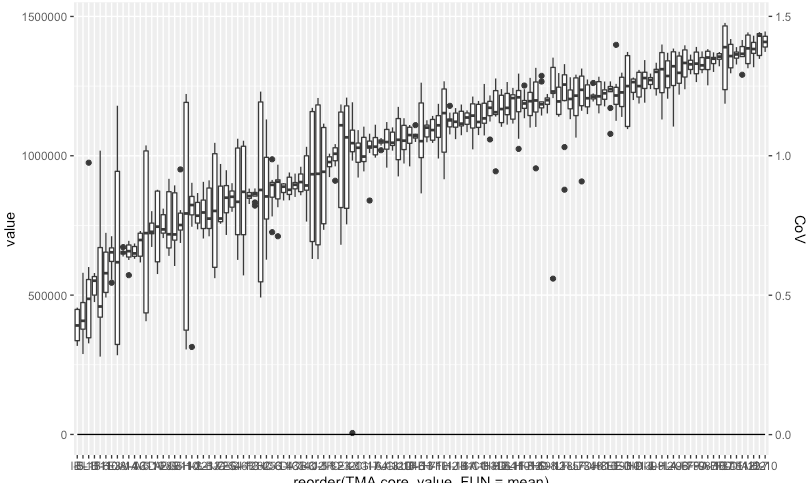 geom_line(data = Merge_stas_mean_order, aes(x = reorder(TMA.core, Mean), y = CoV, group = 1)) +