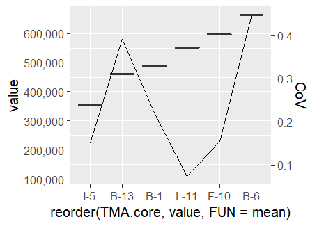 geom_line(data = Merge_stas_mean_order, aes(x = reorder(TMA.core, Mean), y = CoV*ratio, group = 1)) +