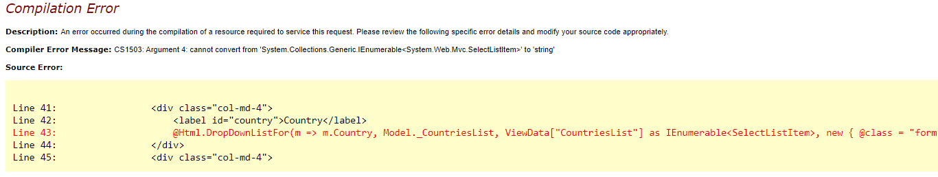 您似乎同时尝试将两个数据源设置为DropDownList,即Model._CountriesList和ViewData["CountriesList"],这会导致构建错误。DropDownListFor没有这样的过载方法,您必须选择其中一个ViewBag或Model。