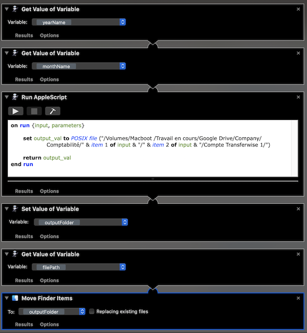 set destinationFolder to ("Macboot :Travail en cours:Google Drive:Company:Comptabilité:" & yearName & ":" & monthName & ":Compte Transferwise 1:Relevé PDF + fichier CSV:" as text)