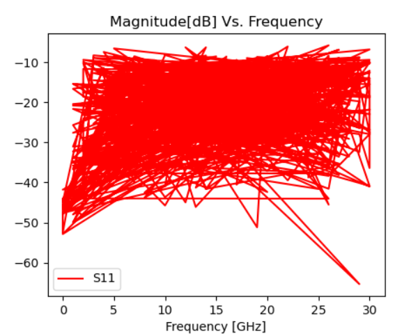 ax1.set_title('Magnitude[dB] Vs. Frequency')我的freq和mag_S11是两个包含200多个元素的列表,问题是我没有得到我想要的图形行为。我画的对不对,还是值错了?
