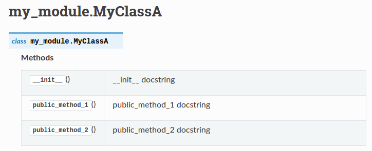 ~MyClassA.public_method_2因此,在生成的html文档中,方法表中只列出了这三个方法,而__call__和__len__不存在: