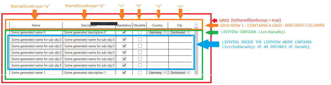 父网格具有Grid.IsSharedSizeScope="True"和所有ColumnDefinitions,在Grid中表示headers的网格和ListView.DataTemplate使用SharedSizeGroup="xxx"中的网格。