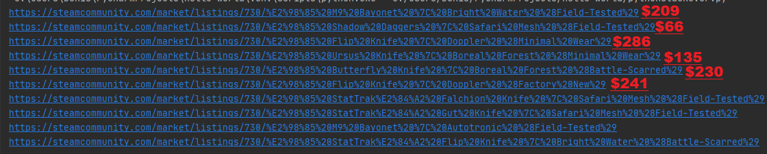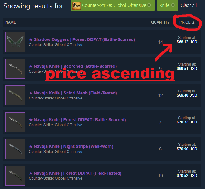 $72.08 USD | https://steamcommunity.com/market/listings/730/%E2%98%85%20Navaja%20Knife%20%7C%20Scorched%20%28Field-Tested%29BTW:是我的第一个版本,它从旧的url中读取并用进行排序。但它只能对第一页上的数据进行排序。为了获得更好的结果,它将必须阅读所有的网页-这将需要很多时间。
