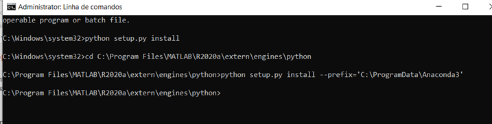 我正试图为python安装matlab引擎,但不起作用,我是从命令行这样做的,没有显示任何内容。以下是我的步骤:我在环境路径上添加了python,而不是找到matlabroot,我在命令行中使用cd安装了matlab内核,而不是运行python setup.py install -前缀=‘C:\ProgramData\Anaconda3’3‘