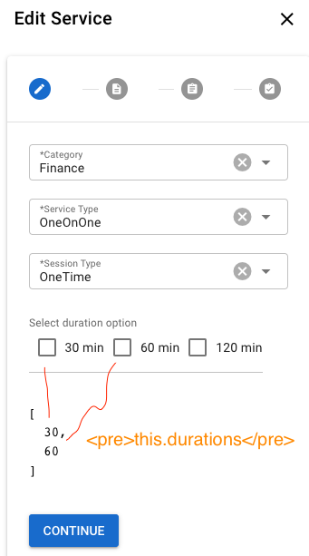 <div> <q-field :value="durations" label="Select duration option" stack-label ref="durations" :rules="[durationRule]" > <template v-slot:control> <q-checkbox :value="durations" val="30" label="30 min" @input="$emit('update:durations', $event)" /> <q-checkbox :value="durations" val="60" label="60 min" @input="$emit('update:durations', $event)" /> <q-checkbox :value="durations" val="120" label="120 min" @input="$emit('update:durations', $event)" /> </template> </q-field> </div>