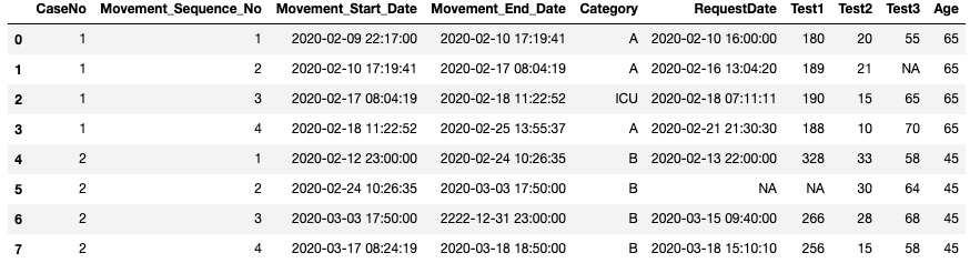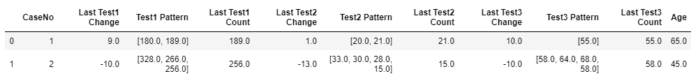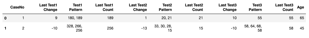1)创建Last Test<n> Change cols -用于遇到Category值“ICU”的CaseNo,在“ICU”值之前进行Test<n>更改( Test1值为189-180,CaseNo 1),否则采用最新的Test<n>更改( Test1、CaseNo 2为256-266)。