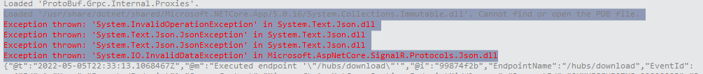 对于带有SignalR客户端和.net 5.0服务器的.net集线器连接,遇到此问题。下面是服务器端错误详细信息的屏幕截图。在这个例子中,我发送了一个十进制作为json有效负载的一部分,比如“”:8.3。当我将十进制转换成像这个"value":"8.3"这样的字符串时,这个问题就消失了。