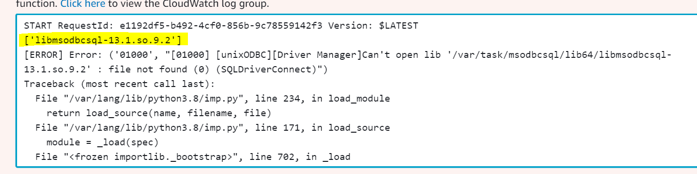 [ERROR] Error: ('01000', "[01000] [unixODBC][Driver Manager]Can't open lib '/var/task/msodbcsql/lib64/libmsodbcsql-13.1.so.9.2' : file not found (0) (SQLDriverConnect)")