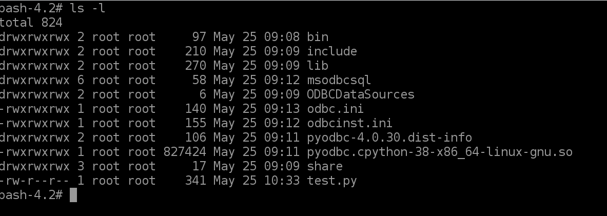 ['bin', 'include', 'lib', 'msodbcsql', 'odbc.ini', 'odbcinst.ini', 'pyodbc.so', 'test.py']