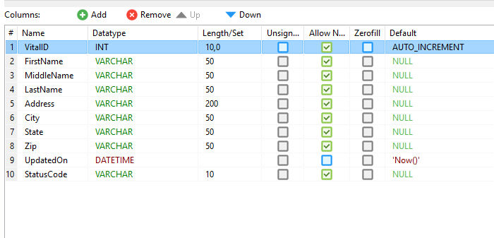 `VitalID` INT(10) PRIMARY KEY NOT NULL AUTO_INCREMENT,