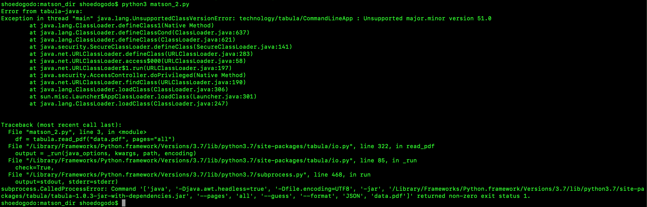 我正在尝试从tabula-py读取数据,但是它返回一个错误,我不知道如何修复它。我的当前代码由以下三行组成