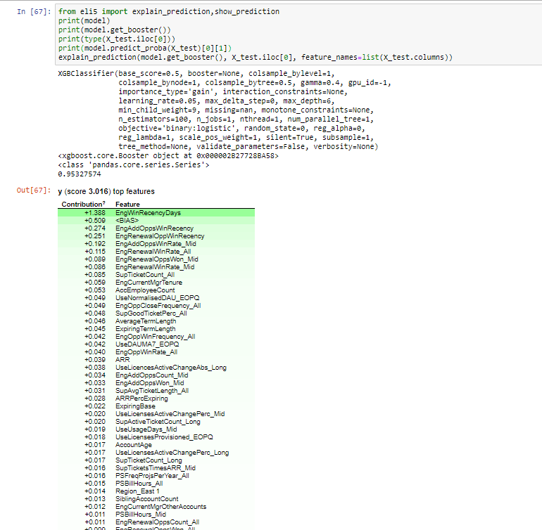 下面是代码片段,显示我的模型、我的预测,然后是"explain_prediction“方法的输出。