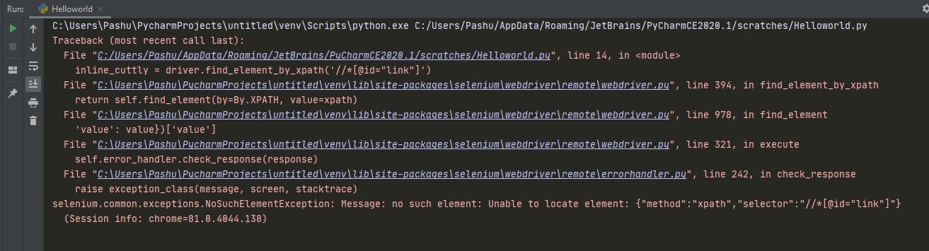 File "C:\Users\Pashu\PycharmProjects\untitled\venv\lib\site-packages\selenium\webdriver\remote\errorhandler.py", line 242, in check_response