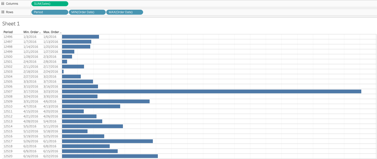 在下面的示例中,我调用了字段期间,并显示了每个期间的数据中最早和最新的日期。
