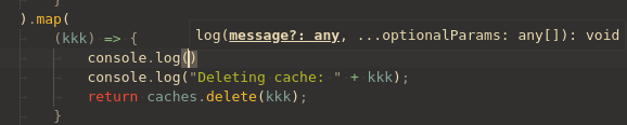 log的方法?),名为message of type (:) any (意味着它可以是任何东西),后面跟着…) (即“删除”所有剩余参数的数组),名为([]) any类型数组的optionalParams,void)注意,从它的外观来看,您得到的IntelliSense似乎来自@types/node包,并且是用于Node.js控制台的。