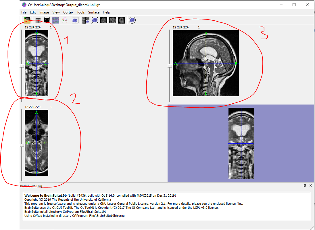 所以,只要使用这个软件打开它,我就意识到nii.gz是一种容器,包含3数组的2d图片。事实上,如果我滚动鼠标,我可以看到448 2d图片的“方向”在图片中标记为1,448 2d图片的“方向”2和252d图片的“方向”3。