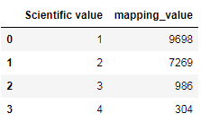 df2=pd.DataFrame({'Scientific value':[1,2,3,4],'mapping_value':[9698,7269,986,304]})