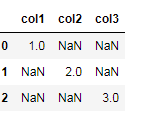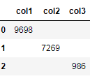 df=pd.DataFrame({'col1':[9698, '',''],'col2':['', 7269, ''], 'col3':['','',986]})